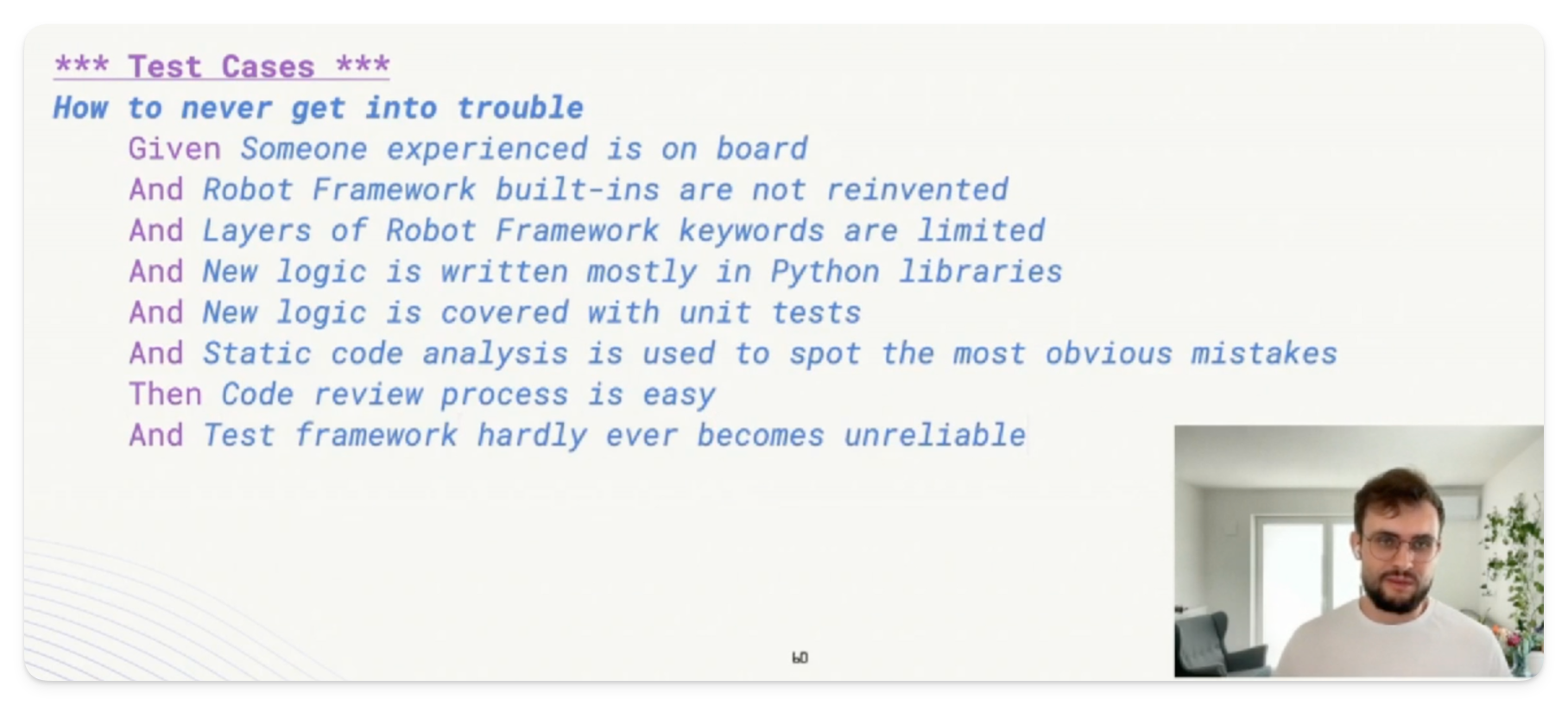 Kacper showed how Pytest can be used to write very effective tests that ensure that keywords can test not only the ‘happy path’ (i.e., that something works), but also the ‘unhappy path’ (e.g., verifying that security and validation mechanisms are working correctly).